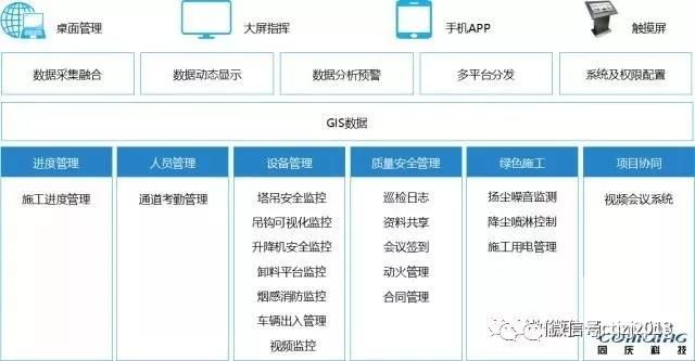 當前項目平臺的功能圍繞人員管理、設備管理、質量安全監(jiān)管、綠色施工、進度管理及多方協(xié)同管理展開,實現(xiàn)對工地現(xiàn)場人員、設備、環(huán)境、流程全要素的信息化,并通過GIS的形式進行展示,實現(xiàn)可視化、智能化的管理。在接入數(shù)據(jù)的基礎上實現(xiàn)動態(tài)展示、分析預警、并按照工地的組織結構權限進行劃分和設定,實現(xiàn)數(shù)據(jù)的有效監(jiān)管。項目部可通過桌面應用、大屏、APP及觸摸屏來查詢數(shù)據(jù),實現(xiàn)隨時隨地的管理。