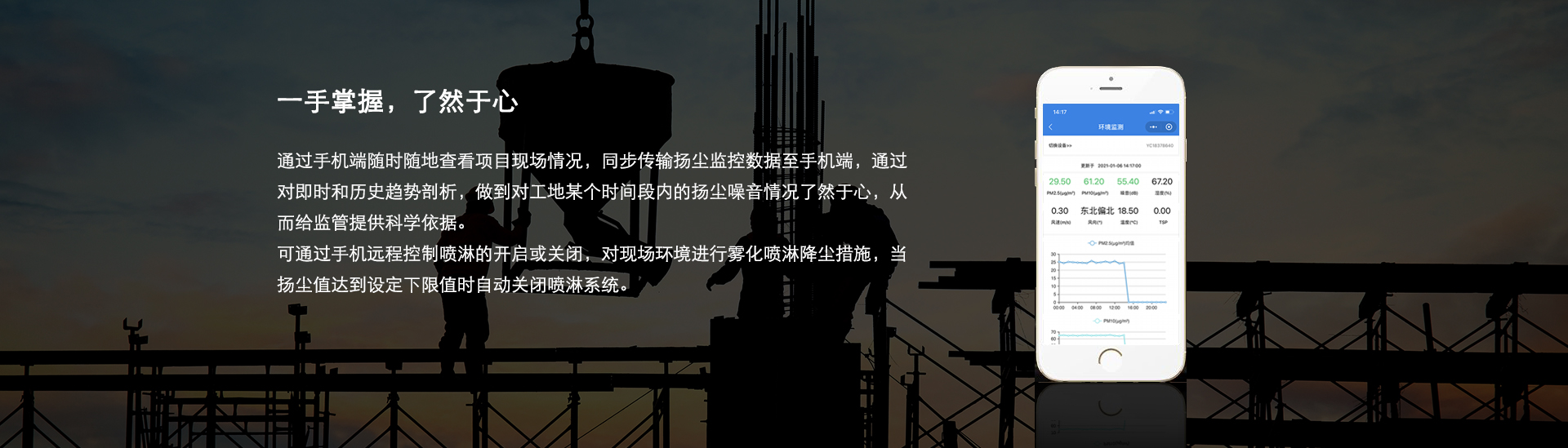 綠色施工,治理建筑施工揚(yáng)塵, 實(shí)時(shí)數(shù)據(jù)變化曲線分析以及智能數(shù)值超標(biāo)自助報(bào)警,支持按時(shí)間段或區(qū)域查看數(shù)據(jù),高效率地實(shí)現(xiàn)工地現(xiàn)場(chǎng)抑塵降塵功能。